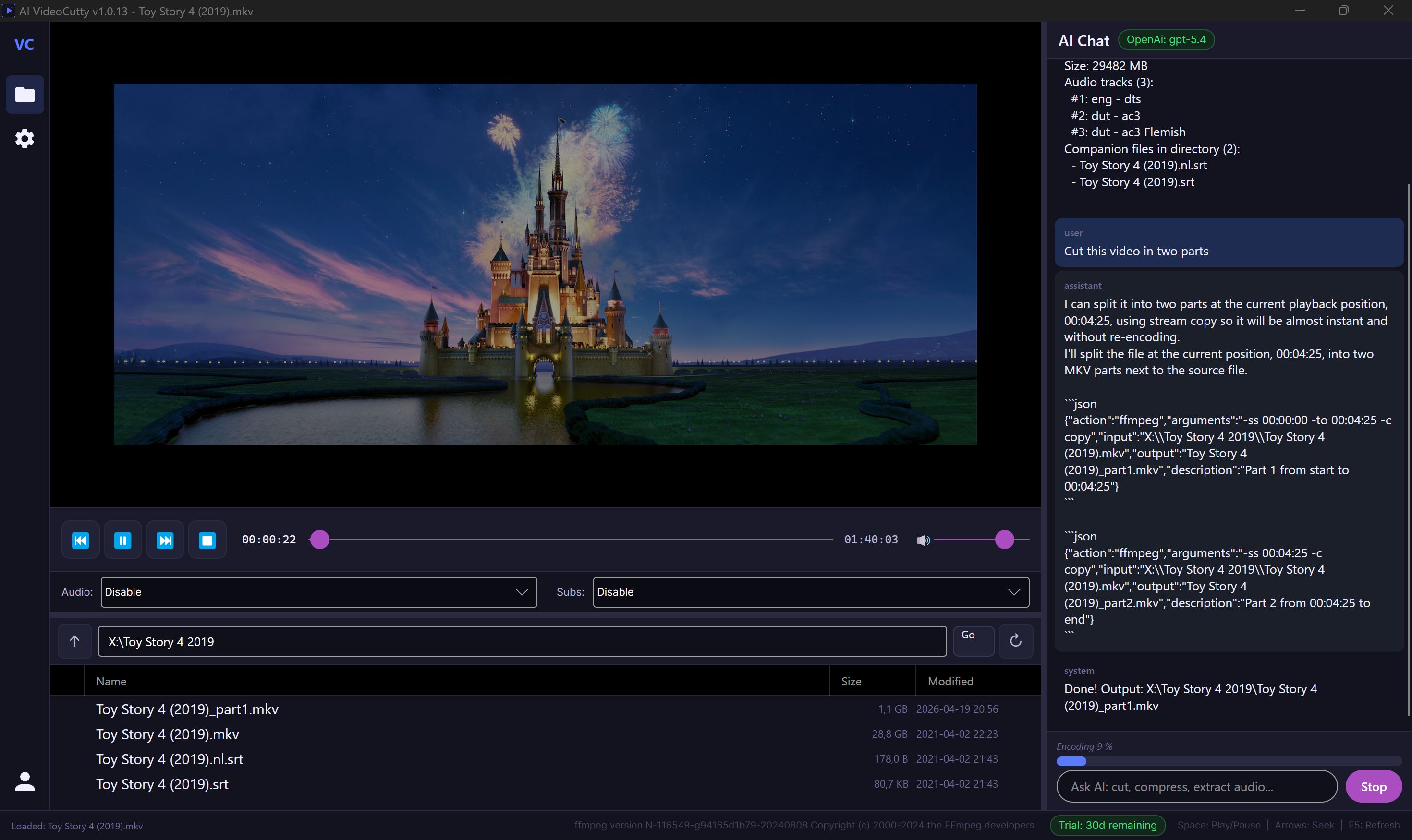 All other video editors ask you to learn their interface. AI VideoCutty does the opposite : it speaks your language. French, English, Spanish — type your request in the chat, the AI understands the context of your video (duration, audio tracks, subtitles, companion files) and automatically triggers FFmpeg, VLC, or Whisper for you.