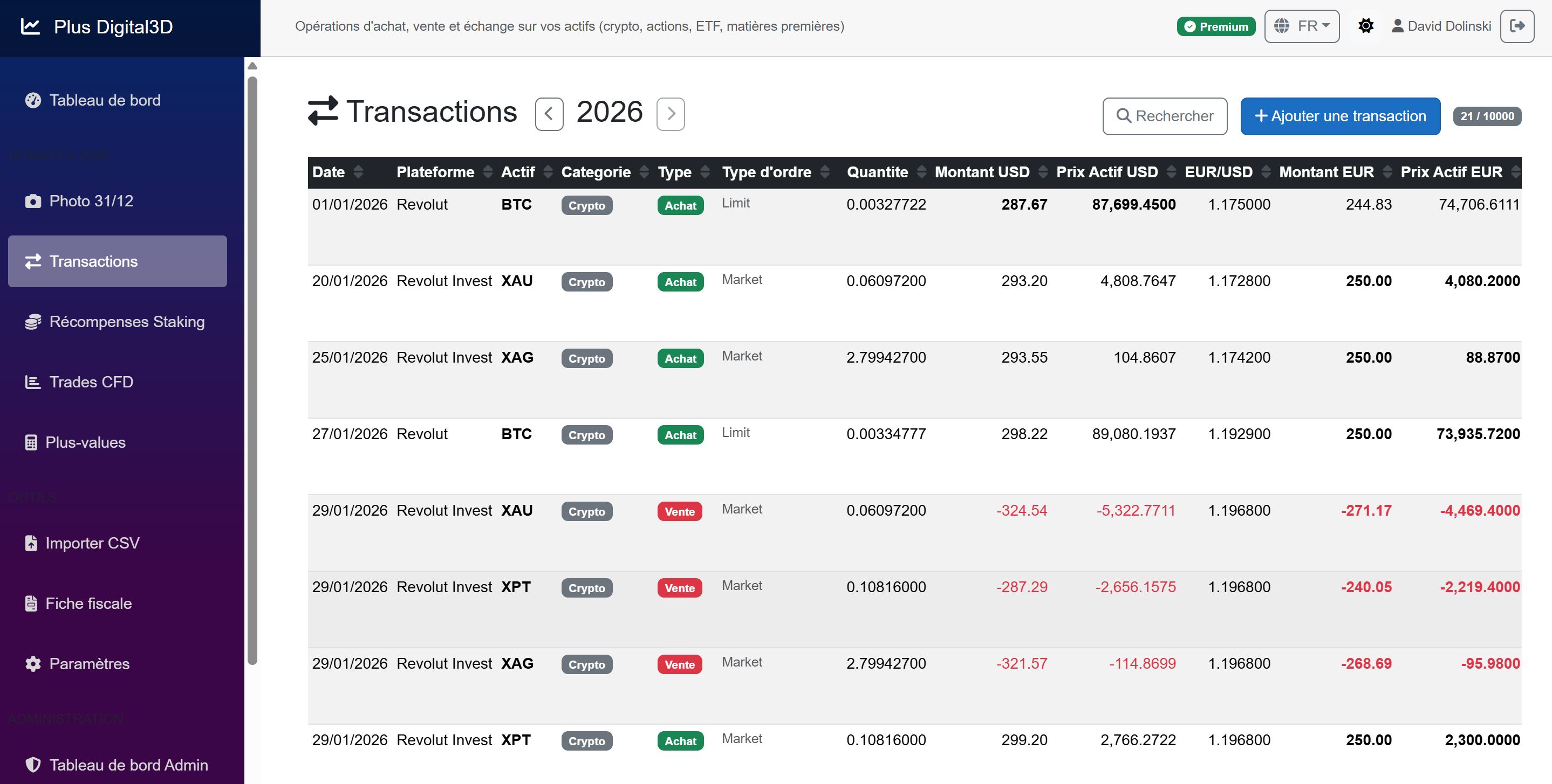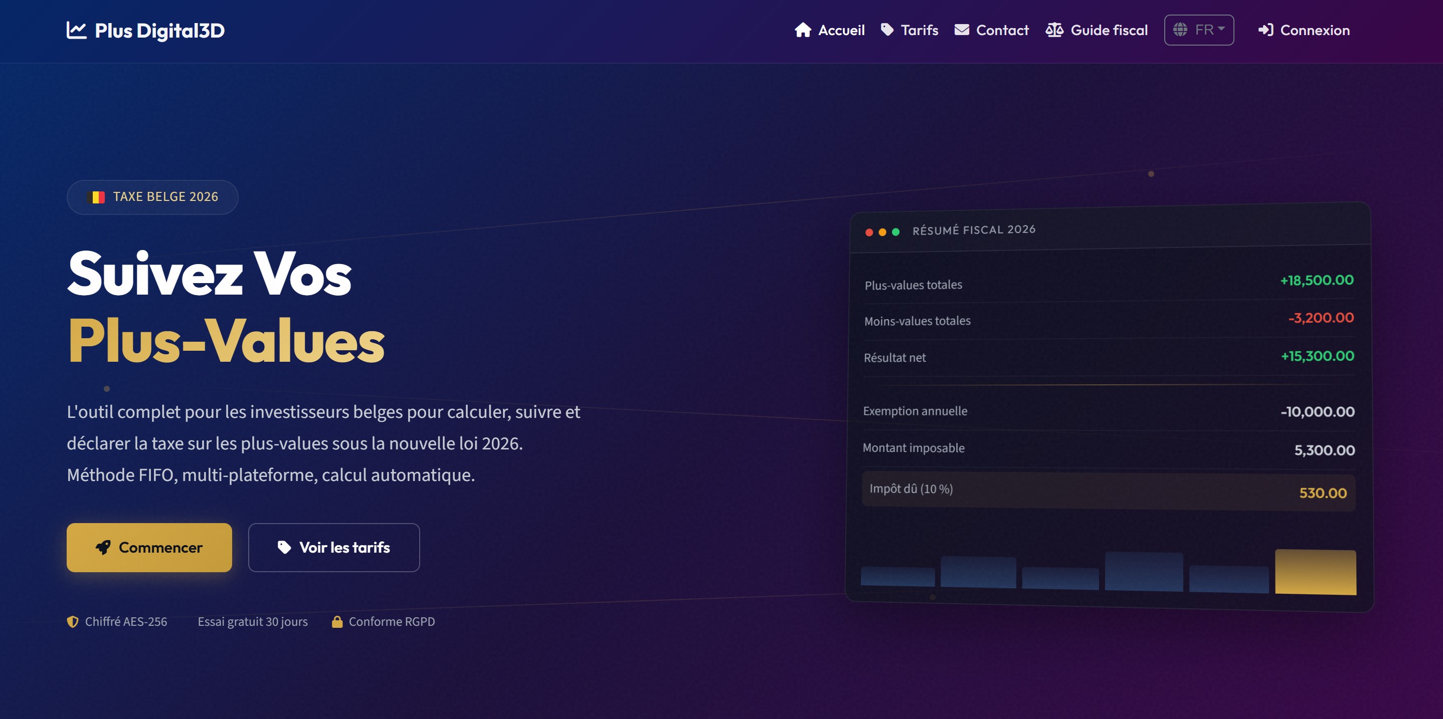 « Plus » from Digital3D is a comprehensive web application that allows you to centralize, calculate, and declare your capital gains in full compliance with Belgian legislation. Whether you are an active trader on CFDs, a long-term investor in crypto, or holding gold and silver, everything is covered.