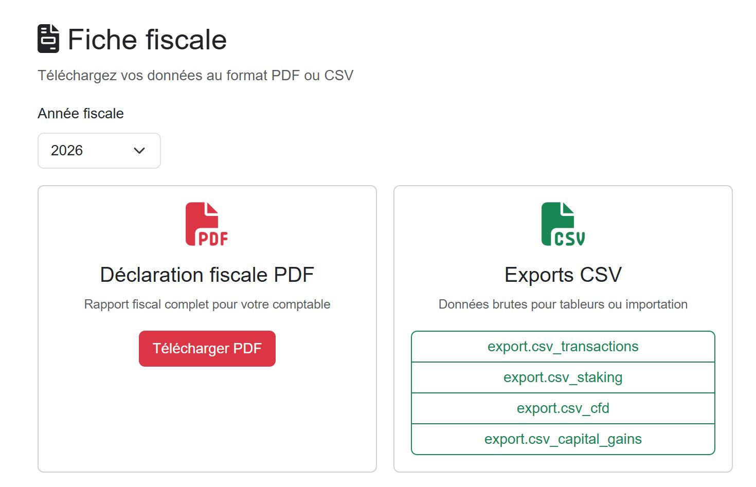 Generate a ready-to-use PDF tax form for your declaration, or export your data in CSV for your accountant.